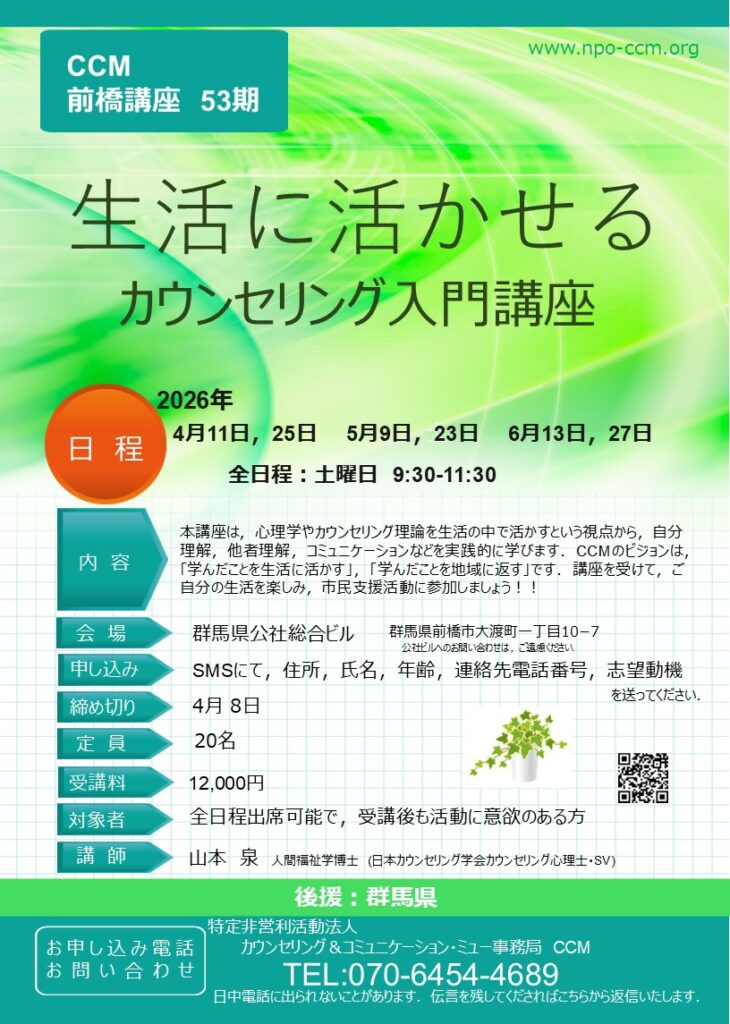 4月 前橋開場「生活に活かせるカウンセリング入門講座」スタート 2026 3/08 トピックス 講座案内 2026年3月8日 目次2026年度 カウンセリング入門講座の前橋からスタート 5月には,太田会場 2027年1月には,伊勢崎講座(ZOOM)と館林講座が続きます トピックス 講座案内 よかったらシェアしてね! URLをコピーしました! URLをコピーしました! ホームページをリニューアルしました この記事を書いた人 admin 関連記事 ホームページをリニューアルしました 2026年1月30日 コメント コメントする コメントをキャンセルコメント ※ 名前 ※ メール ※ サイト 次回のコメントで使用するためブラウザーに自分の名前、メールアドレス、サイトを保存する。